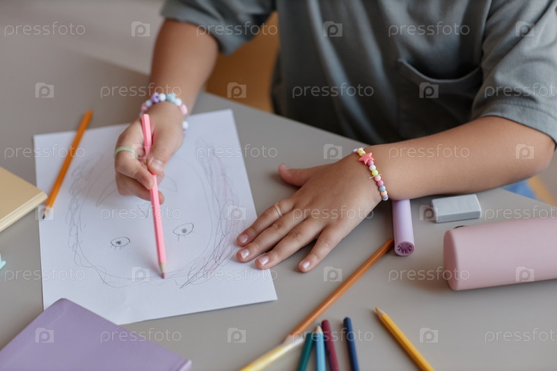 Сверху вид неузнаваемая девушка рисует лицо с карандашами в помещении