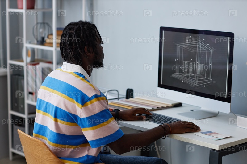 Дизайнер рисует чертеж на компьютере