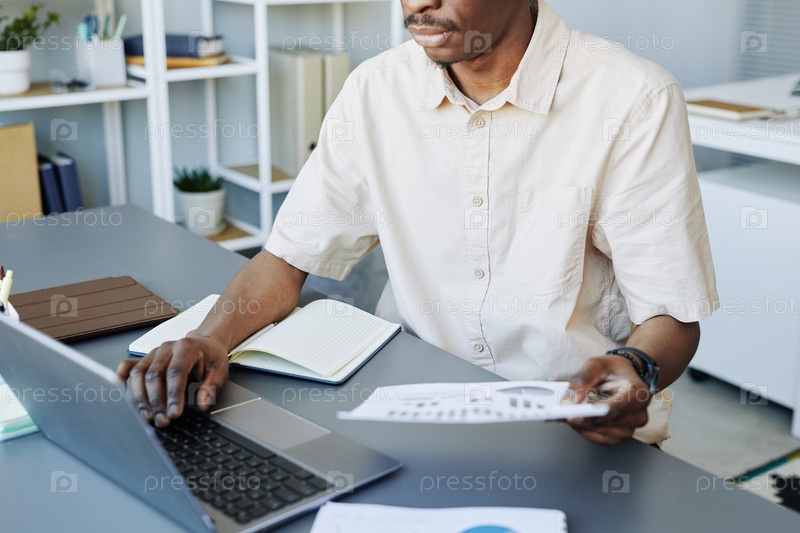 Непризнанный чернокожий мужчина использует компьютер на работе
