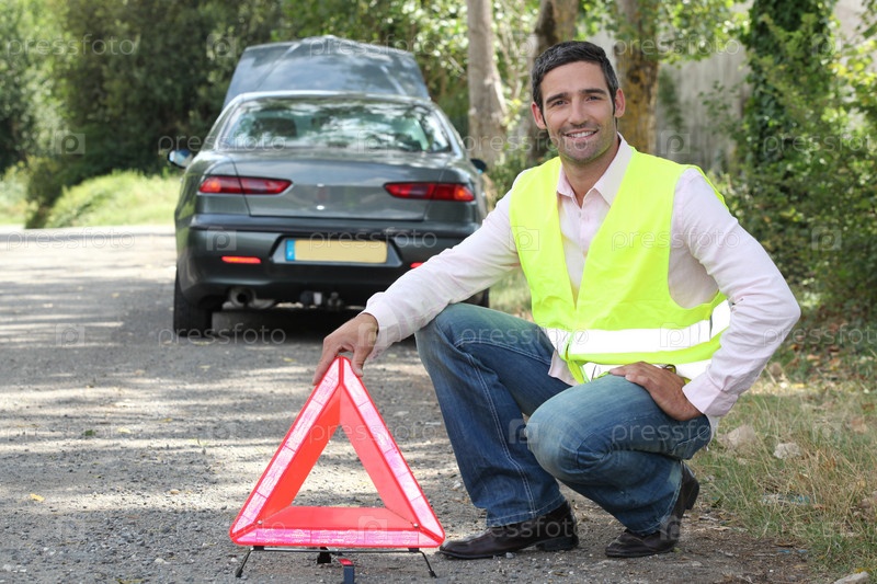Мужчина ставит предупреждающий треугольный знак