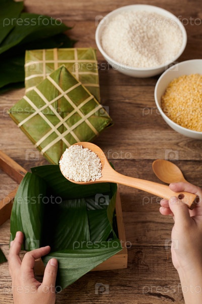 Руки делают липкий рисовый торт