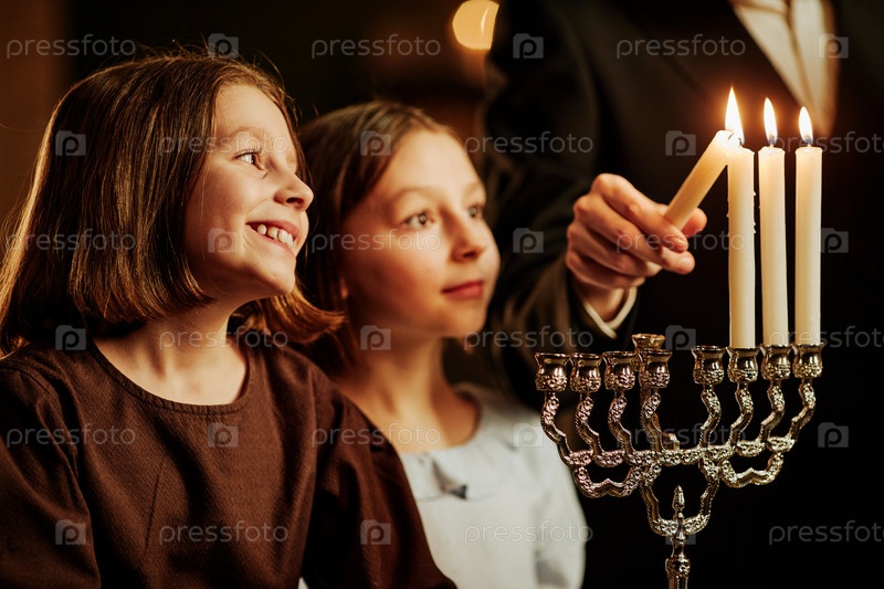 Улыбающиеся девушки, смотрящие на свечу менора