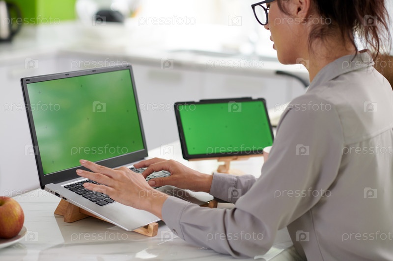 Обрезанный снимок молодой женщины-фрилансера, печатающей на клавиатуре ноутбука