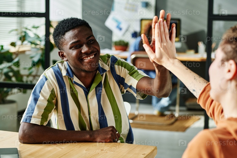 Молодой успешный афроамериканский бизнесмен дает высокую пятерку коллеге