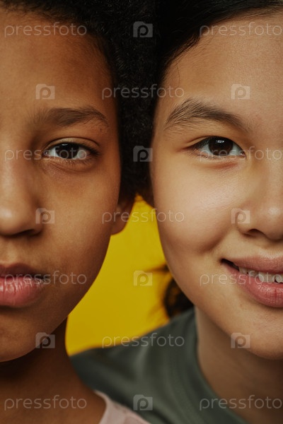 Близкий план половины лиц двух молодых мультикультурных девушек