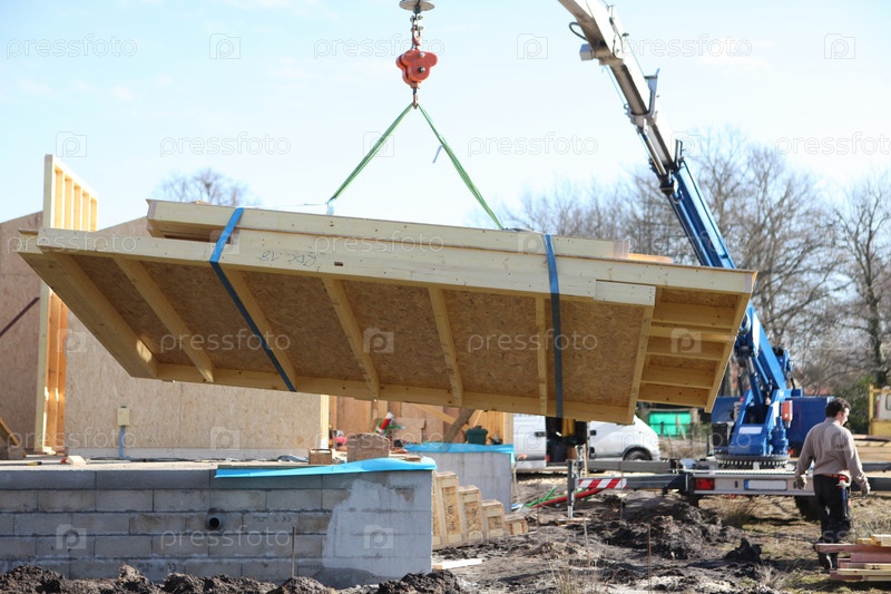 Кран поднимает стену дома