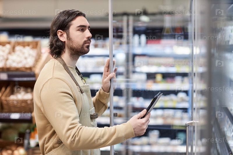 Мужчина-работник в супермаркете, проверяющий инвентарь молочных продуктов