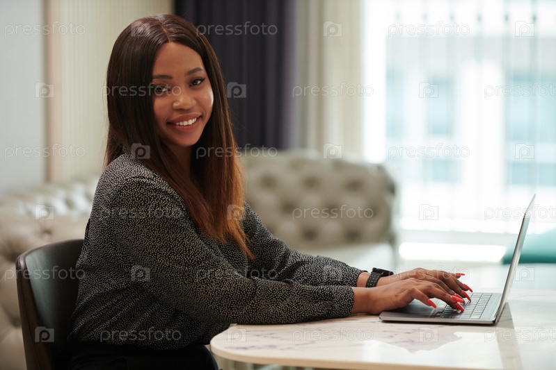 Позитивная молодая чернокожая работающая женщина