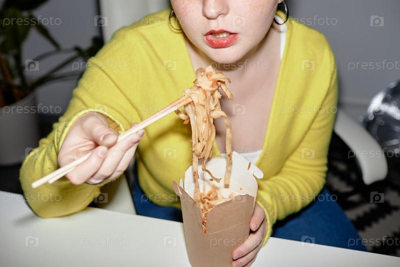 Ближайшее изображение молодой женщины, которая ест лапшу на вынос в помещении