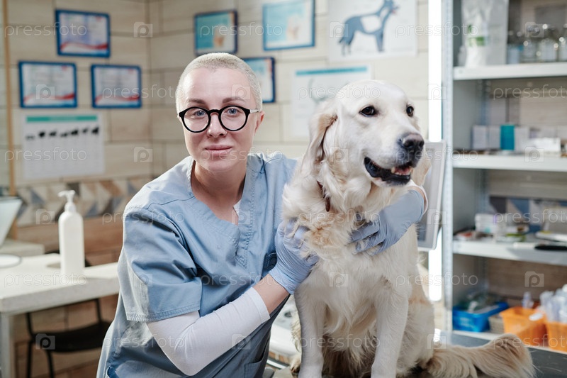 Врач с домашней собакой работает в ветеринарной клинике