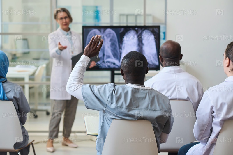 Люди задают вопросы на медицинской конференции