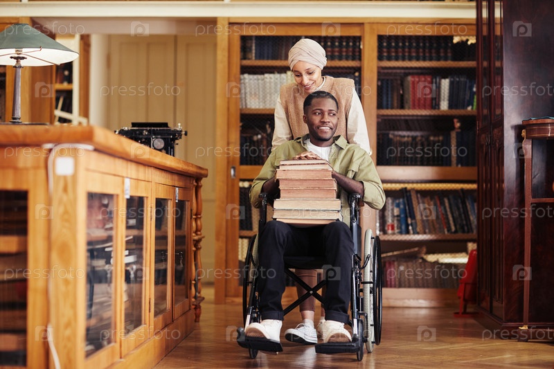 Молодой человек, пользующийся инвалидной коляской в библиотеке