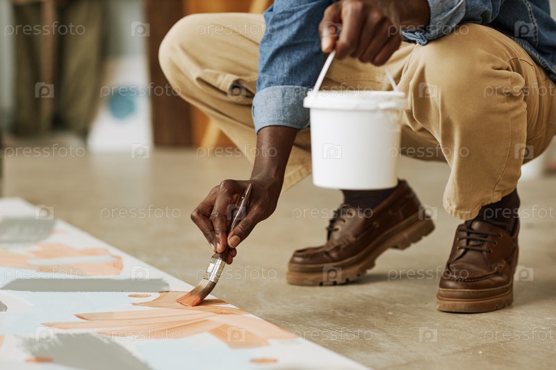 Низкая секция афроамериканского художника-мужчины, рисующего на холсте