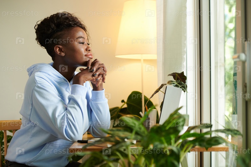 Задумчивая женщина, сидящая за рабочим столом