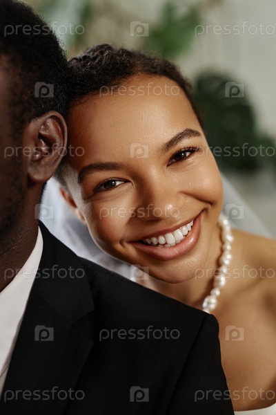Ближайшее изображение красивой черной невесты, смотрящей на камеру через плечо мужа