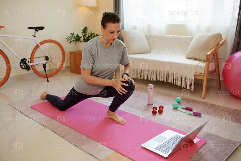 Женщина, следующая за онлайн-инструктором по фитнесу