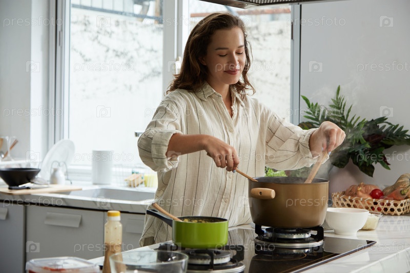Счастливая женщина, готовящая спагетти