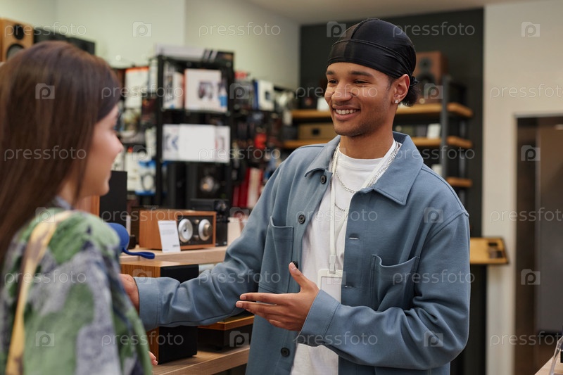 Чернокожий молодой человек консультирует клиента в музыкальном магазине и счастливо улыбается