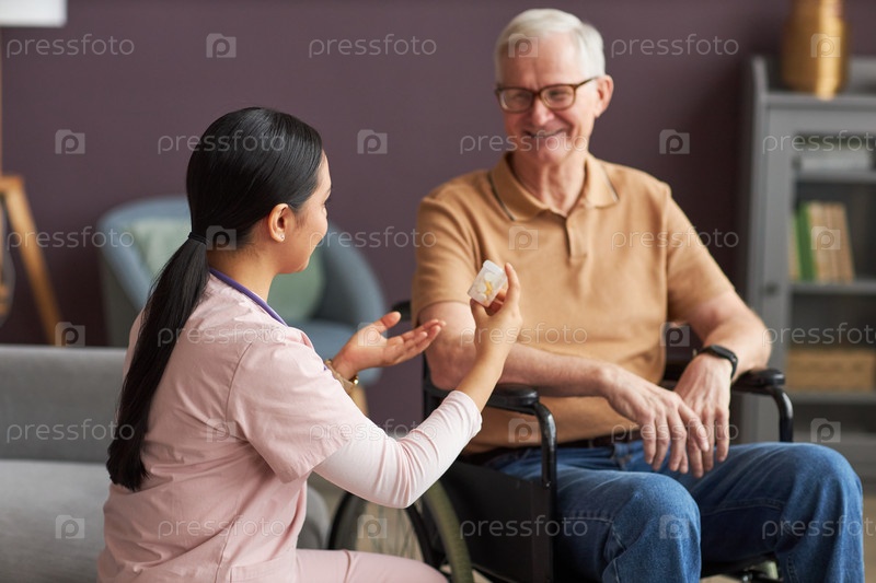 Медсестра дает таблетки пожилому мужчине с инвалидностью
