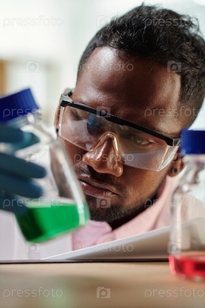 Молодой интерн-мужчина в защитных очках смотрит на банку с зеленой жидкостью