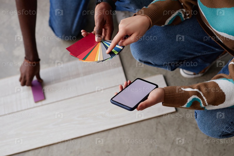 Дизайнер выбирает цвет для напольного покрытия вместе с клиентом