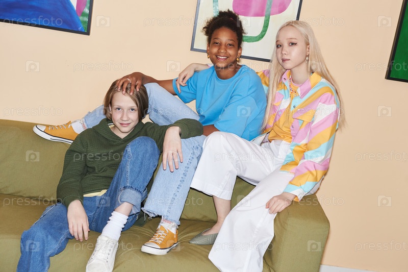 Группа подростков, одетых в красочную повседневную одежду внутри с флэшем