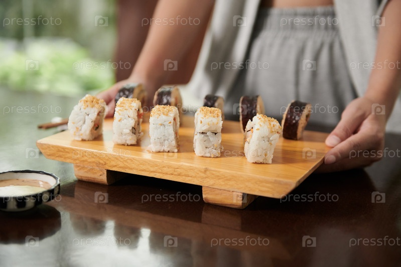 Деревянная доска с суши на ужин