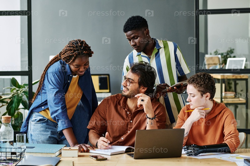 Счастливый молодой бизнесмен смотрит на коллегу во время объяснения