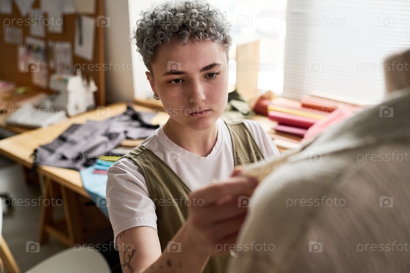 Молодая швея с седыми короткими кудрявыми волосами стоит перед манекеном