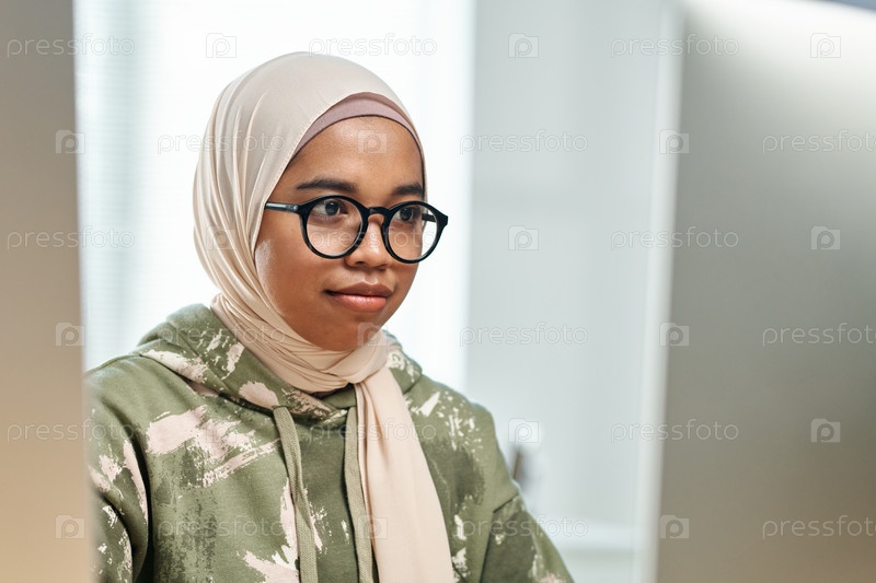 Молодая чернокожая мусульманка в хиджабе и очках сидит перед компьютером
