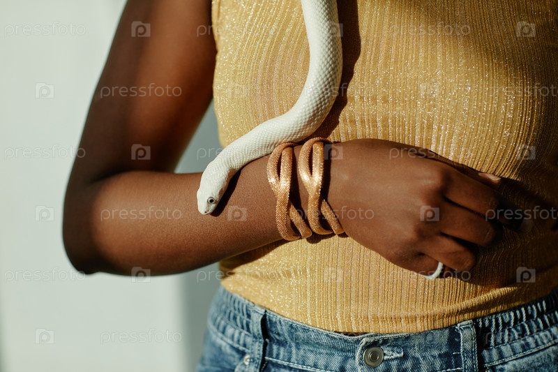 Близкий план руки молодой чернокожей женщины с золотым браслетом на запястье и змеей