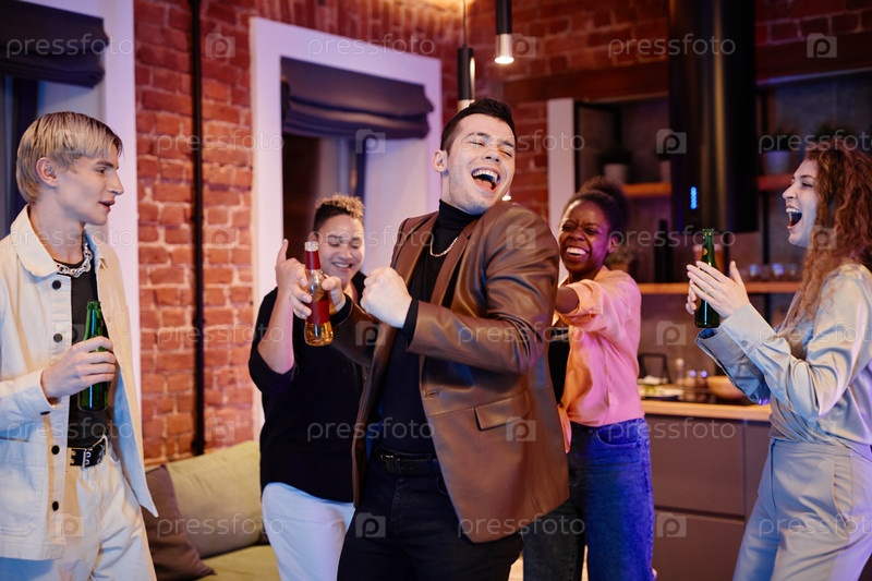 Группа счастливых молодых мультикультурных людей в повседневной одежде, танцующих на домашней вечеринке
