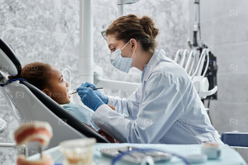 Женщина-стоматолог, работающая с ребенком в стоматологической клинике обследование зубов