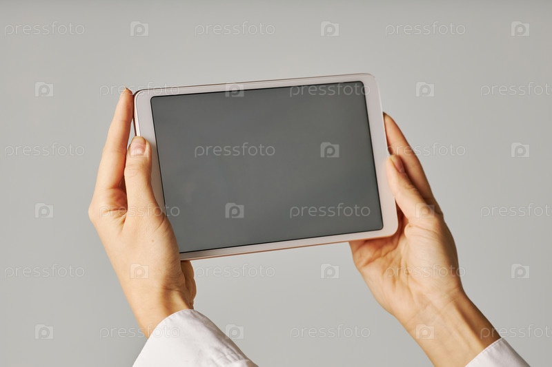 Закройте женские руки, держащие планшет с пустым экраном на белом фоне