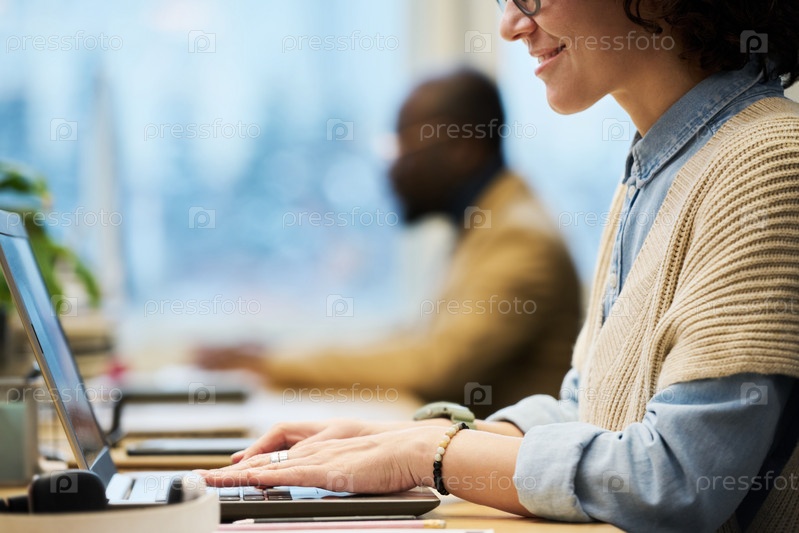 Близкий план молодой менеджерки, печатающей перед ноутбуком