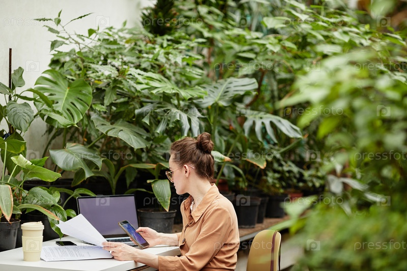 Молодая бизнес-женщина прокручивает свой смартфон по месту работы