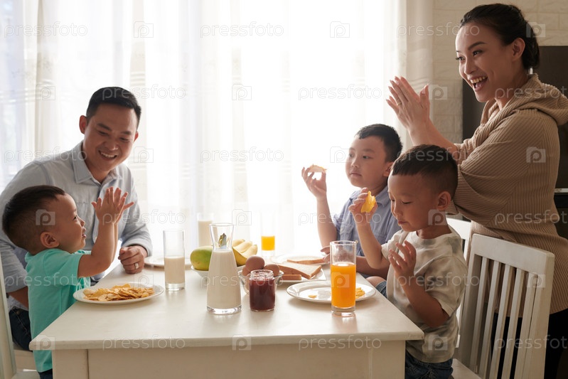 Большая семья ест завтрак