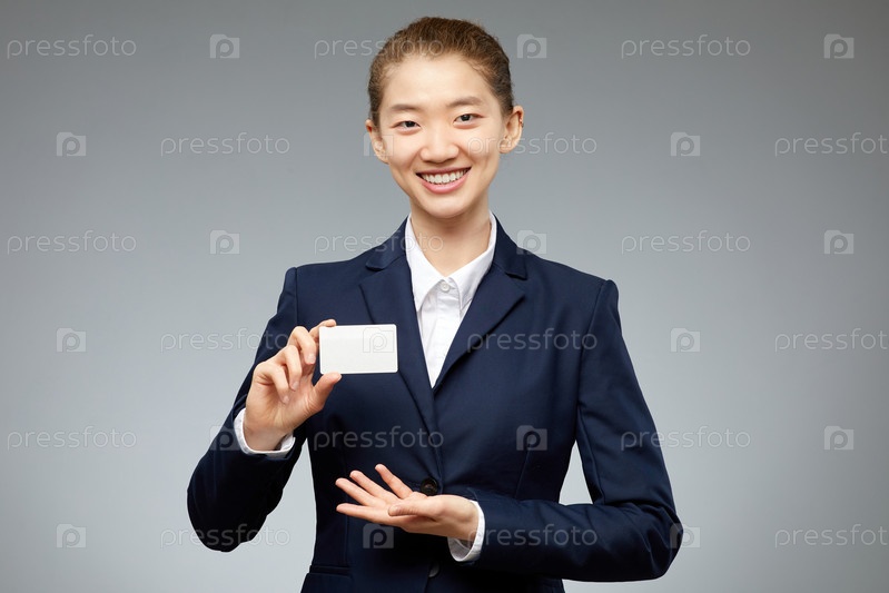Фотореалистичная бизнесвуменка, показывающая визитку