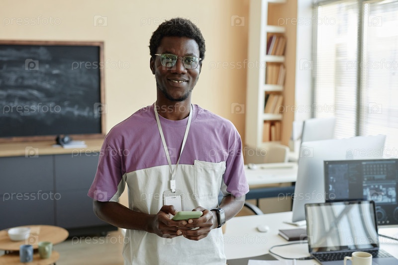 Молодой улыбающийся менеджер в очках и повседневной одежде смотрит на камеру