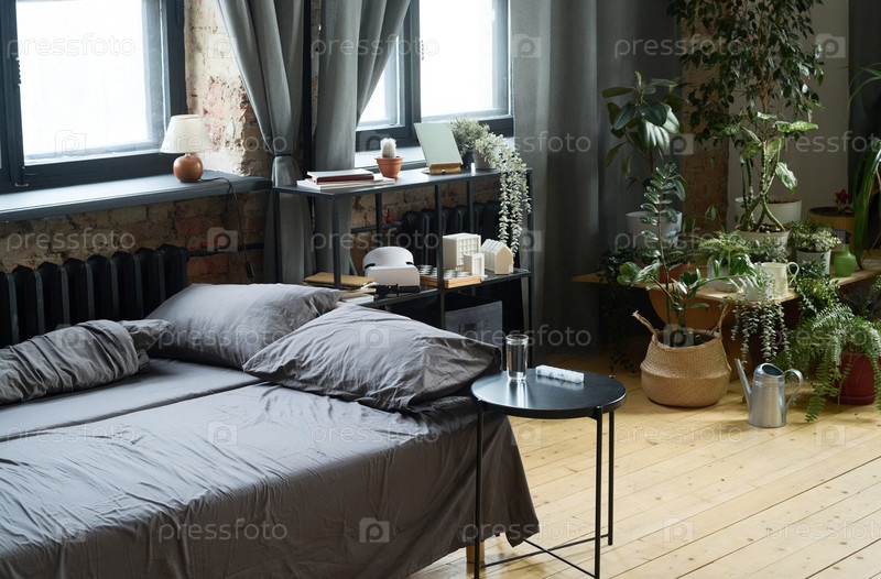 Спальня с кроватью и домашними растениями