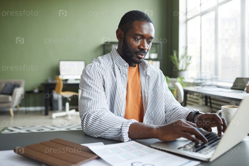 Афроамериканский бизнесмен, использующий ноутбук в офисе