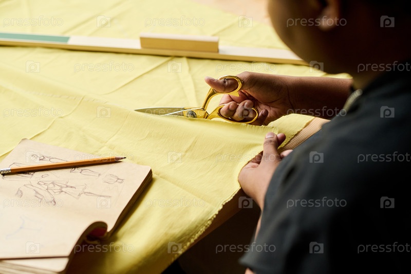 Рука молодой чернокожей женщины с ножницами, режущей желтый текстиль по рабочему месту