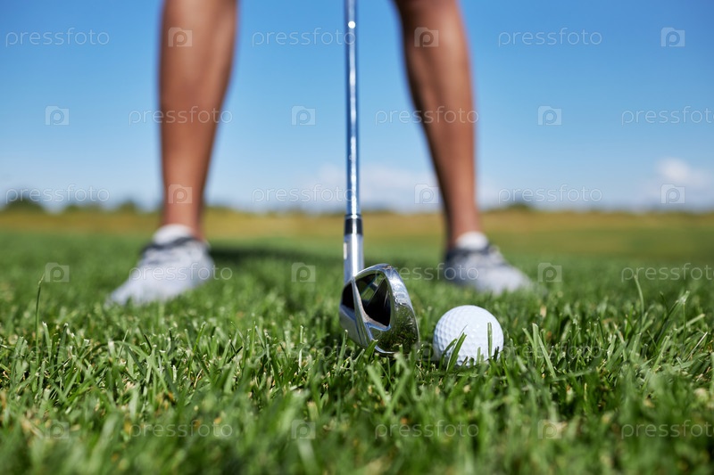 Ближайшее изображение человека, играющего в гольф на зеленой траве, мяч