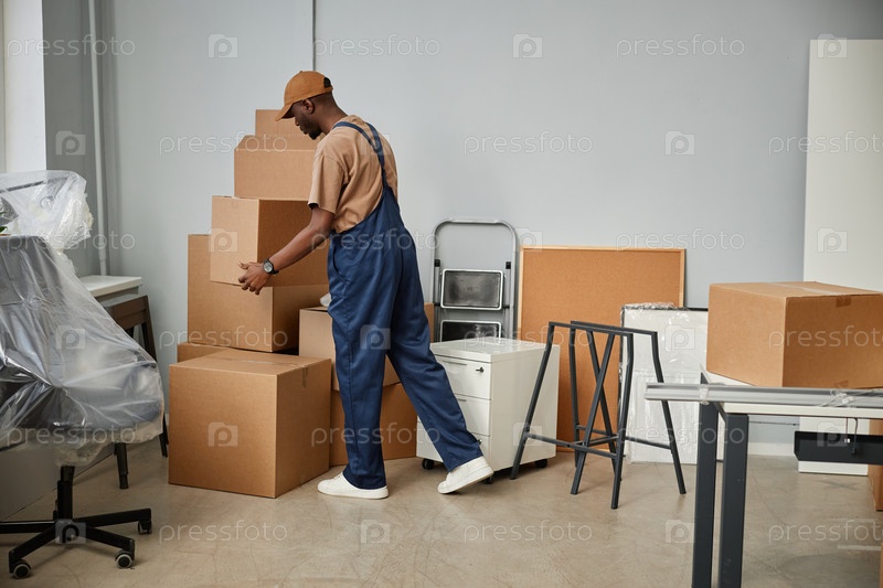 Погрузчик, несущий коробки в новом офисе