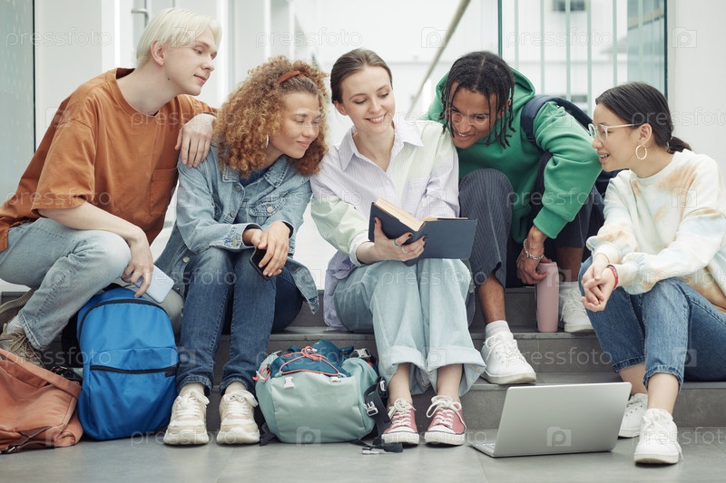Большая группа подростков в повседневной одежде читают книгу, которую держит улыбающаяся девушка