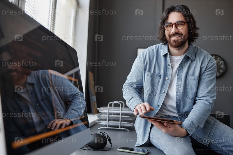 Улыбающийся бородатый мужчина сидит за столом в ИТ-офисе и смотрит на камеру