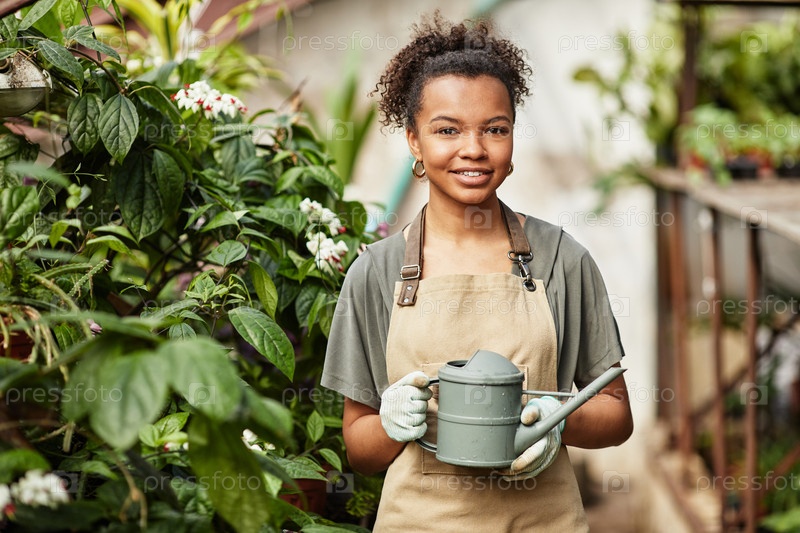 Счастливая молодая межнациональная садовница, держащая поливную банку