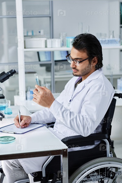 Боковой вид клинициста в инвалидном кресле, описывающего характеристики вещества