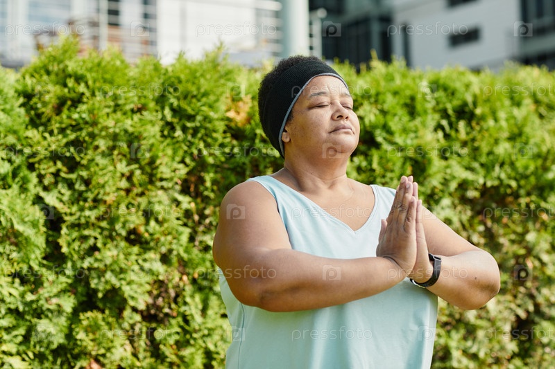 Женщина с избыточным весом медитирует на свежем воздухе