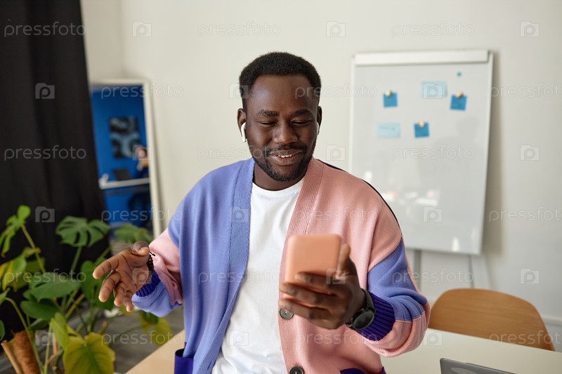 Творческий чернокожий мужчина, использующий смартфон с видеочатом в офисе